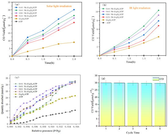 The catalytic performance was evaluated through CO2 reduction experiments under illumination. Besides CO, CH4 and CH3OH were also detected, but their yields were significantly lower than that of CO. As shown in Figure 10a,b, the CO yield over ATP remained very low and essentially unchanged with an increase in illumination time. The Co3O4/ATP catalyst synthesized from analytical-grade reagents exhibited a CO production rate of 8.99 μmol·g−1, which is markedly lower than that of the Ni:Co3O4/ATP catalysts derived from spent LIBs. Under solar light irradiation, the CO production rate continuously increased over time. Among the catalysts, the 0.4:1 Ni:Co3O4/ATP composite demonstrated the most outstanding catalytic performance, achieving a CO production rate of 30.1 μmol·g−1. Under infrared (IR) light irradiation, the overall CO production rates decreased. The Co3O4/ATP sample prepared from analytical-grade reagents showed a rate of 4.3 μmol·g−1, still lower than those of the LIBs-derived Ni:Co3O4/ATP catalysts. The 0.4:1 Ni:Co3O4/ATP sample reached a CO production rate of 10.3 μmol·g−1 under IR light. Figure 10c depicts the CO2 adsorption capacities of ATP, Co3O4/ATP, and Ni:Co3O4/ATP at 25 °C and 1 bar. At 25 °C, ATP exhibited a CO2 adsorption capacity of only 10.3 mmol·g−1. In contrast, the 0.4:1 Ni:Co3O4/ATP sample demonstrated a significantly higher capacity of 33.9 mmol·g−1, far exceeding the 21.5 mmol·g−1 capacity of the Co3O4/ATP sample prepared from analytical-grade reagents. The superior catalytic performance of the LIBs-derived samples compared to those prepared from analytical-grade reagents can be attributed to two main factors. First, spent LIBs contain trace amounts of Ni, which can be doped into the Co3O4 lattice. This doping promotes the formation of a greater number of oxygen vacancies, leading to enhanced catalytic activity—consistent with the EPR analysis. Second, the LIBs were processed in acidic solution, and the subsequent loading of the active components onto ATP also occurred in acidic conditions. This acid treatment effectively opens up ATP’s inherent one-dimensional nanochannels and increases its specific surface area, thereby enhancing its physical CO2 adsorption capacity. The recyclability of the optimal 0.4:1 Ni:Co3O4/ATP catalyst was assessed. After washing with deionized water, the catalyst underwent five consecutive photocatalytic CO2 reduction cycles. As demonstrated in Figure 10d, the catalyst maintained high catalytic activity throughout these cycles, indicating excellent recyclability and stability.