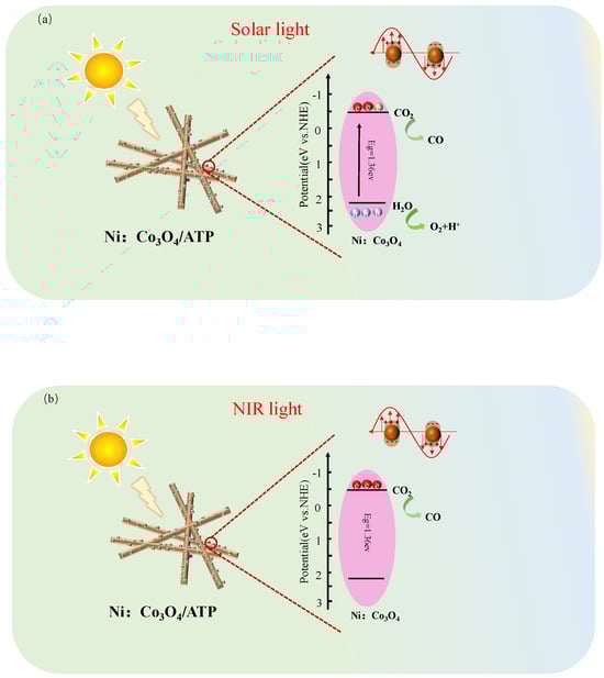 Based on the aforementioned experimental results, a mechanism for the photothermal catalytic reduction of CO2 over Ni:Co3O4/ATP is proposed. Figure 11a illustrates the proposed mechanism under full-spectrum solar irradiation. As for the Ni:Co3O4/ATP composite, ATP primarily acts as a support. The acid treatment during processing effectively opens up ATP’s inherent one-dimensional nanochannels and increases its specific surface area, thereby enhancing its CO2 adsorption capacity. Under solar light irradiation, Ni:Co3O4 is photoexcited, generating electron–hole pairs. Concurrently, LSPR is induced in the Ni:Co3O4 nanoparticles supported on ATP, facilitated by oxygen vacancies. This LSPR effect operates through two synergistic pathways. First, hot electrons generated on the Ni:Co3O4 surface react with adsorbed CO2 molecules. Second, the photothermal effect elevates the local temperature at the Ni:Co3O4/ATP interface. These synergistic effects enhanced charge carrier dynamics from plasmonic excitation along with localized heating, which may collectively promote the photothermal reduction of CO2, leading to improved reaction efficiency and catalyst performance. Figure 11b depicts the reaction mechanism under IR light irradiation. Under IR light, Ni:Co3O4 cannot be photoexcited. Only the LSPR effect occurs, generating hot electrons. These hot electrons react with protons (H+) derived from water splitting to produce a limited amount of CO. Crucially, in this photocatalytic CO2 reduction system, oxygen vacancies serve as charge carrier traps. They significantly promote interfacial charge transfer at the catalyst surface while effectively suppressing the recombination of photogenerated electrons and holes.