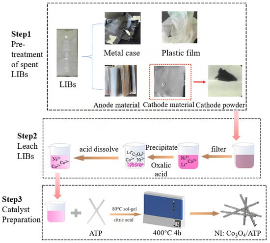 Scheme for the synthesis of the Ni:Co3O4/ATP composite from spent lithium-ion batteries (LIBs).