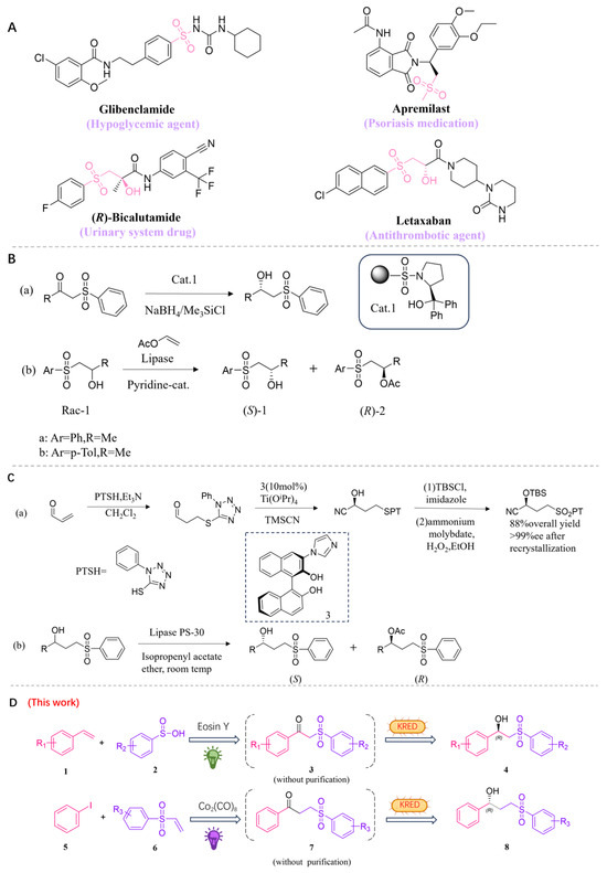Furthermore, ketosulfones are not commercially available and must be synthesized in advance. Therefore, there is a strong demand for the development of an environmentally friendly process to prepare prochiral ketosulfones from simple, readily available materials under mild conditions. Photocatalysis has become a potent method that utilizes visible light to induce unique reactivity, which cannot be achieved through thermal activation, by producing open-shell intermediates. Visible-light-driven photocatalysis provides a gentle, sustainable, and clean approach to chemical activation by transforming photonic energy into chemical energy [39,40,41,42,43,44]. Therefore, we aimed to develop a one-pot photo-biocatalytic cascade reaction, which benefits from the selectivity of enzymes and the reactivity of photocatalysts, to synthesize chiral hydroxysulfones [45,46]. In the consecutive one-pot process, the desired products can be obtained without the need for isolation and purification of intermediates. This approach minimizes production cycles and costs, saves time and resources, and reduces waste. In our group, we have been dedicated to using biocatalysts and photocatalysts to synthesize pharmaceutical molecules and potentially bioactive compounds in environmentally friendly ways, so we were motivated to embark on this study [47,48,49,50].