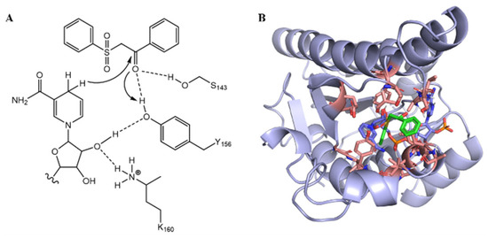 (A) Proposed catalytic mechanism of 3a by LkKRED. (B) Molecular docking modes of 3a in LkKRED. The substrate (3a) is shown as green sticks; the NADPH as light purple sticks; the amino acid residues in the range of substrate 5 Å as pink sticks.