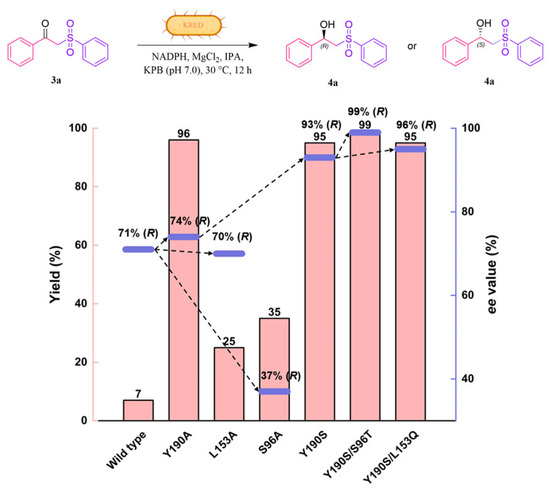 A total of 17 residues were identified within a 5 Å range of 3a, specifically A94, V95, S96, E145, T152, L153, G189, Y190, I191, T193, L195, V196, L199, E200, A202, S143, and Y156 (Figure 2B). In the first round of evolution, an alanine-scanning strategy was employed, wherein residues that were either alanine or glycine were mutated to tyrosine, while S143 and Y156 were excluded from mutagenesis due to their established roles in the catalytic triad. Following successful construction through site-directed mutagenesis, the catalytic activity and stereoselectivity of 15-site alanine mutants against 3a were evaluated within a whole-cell system (Table S2). Three critical positions (S96, L153, and Y190) were identified based on the results of alanine-scanning experiments, as mutations at these positions resulted in significant alterations in both catalytic activity and stereoselectivity (Figure 3). Notably, the catalytic activity of the Y190A mutant increased significantly, achieving up to a 14-fold enhancement (96% yield) compared to the WT LkKRED. Consequently, we initially conducted NNK codon saturation mutagenesis on the Y190 residue (Table S2). Encouragingly, the reaction yield of the Y190S variant reached 95%, accompanied by an ee of 93%. To further enhance the yield and enantioselectivity of the ketosulfone reduction reaction catalyzed by LkKRED, iterative saturation mutagenesis was performed on the S96 and L153 residues using Y190S as a template (Table S2). As illustrated in Figure 3, the iterative mutation of S96 based on Y190S demonstrated an improvement in both catalytic efficiency and enantioselectivity. The yield of the Y190S/S96T variant reached 99%, with the ee up to 99%. Among all Y190S/L153X mutations, Y190S/L153Q emerged as the most favorable mutation, yielding 95% with an ee up to 96%.