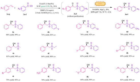 Procedure of the one-pot photo-enzymatic cascade system of β-hydroxysulfones. A total of 0.2 mmol (1a-g), 0.3 mmol (2a-f), Eosin Y (1.0 mol%), and 0.6mmol TBHP were dissolved in a mixture of EtOH/H2O at a ratio of 1.6 mL: 0.4 mL and then stirred under a 30 W green LED for 24 h at room temperature under a nitrogen atmosphere. The synthesis of β-ketosulfones (3a-l) had been successfully achieved at this point. Then the reaction was carried out with 0.1 g/mL wet cell with Y190S/S96T LkKRED, 0.2 mM NADPH, 0.1 mM MgCl2, and 5% v/v IPA in 2 mL of 0.1 M KPB buffer and pH 7.0 at 30 °C and 220 rpm for 12 h. The mutants used for the photo-enzymatic cascade were Y190S/S96T-LkKRED. At the end of the cascade reaction, the product was extracted with ethyl acetate (3 × 2 mL). The organic layer was then concentrated in vacuo and purified by flash column chromatography on silica gel (petroleum ether/EtOAc = 1/10 − 1/4, v/v) to afford the desired product 4a-l. Weighing the purified 4a-l, the yield was calculated based on the theoretical yield extrapolated from 1a-g. The dried sample was then analyzed by chiral HPLC to determine the ee value of β-hydroxysulfones (4a-l).
