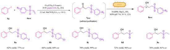 Procedure of the one-pot photo-enzymatic cascade system of γ-hydroxysulfones. A total of 0.3 mmol (5a), 0.2 mmol (6a-e), and Co2(CO)8 (0.2 mmol) were dissolved in a mixture of MeCN/H2O at a ratio of 2.0 mL: 0.2 mL and then stirred under a 30 W purple LED for 24 h at room temperature under a nitrogen atmosphere. The synthesis of γ-ketosulfones (7a-e) has been successfully achieved at this point. Then the reaction was carried out with 0.1 g/mL wet cell with Y190S/S96T LkKRED, 0.2 mM NADPH, 0.1 mM MgCl2, and 5% v/v IPA in 2 mL of 0.1 M KPB buffer and pH 7.0 at 30 °C and 220 rpm for 12 h. The mutants used for the photo-enzymatic cascade were Y190S/S96T-LkKRED. At the end of the cascade reaction, the product was extracted with ethyl acetate (3 × 2 mL). The organic layer was then concentrated in vacuo and purified by flash column chromatography on silica gel (petroleum ether/EtOAc = 1/10 − 1/4, v/v) to afford the desired product 8a-e. Weighing the purified 8a-e, the yield was calculated based on the theoretical yield extrapolated from 6a-e. The dried sample was then analyzed by chiral HPLC to determine the ee value of γ-hydroxysulfones (8a-e).