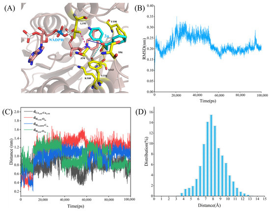 As shown in Figure 7A, the substrate 3a is located within an active pocket formed by several amino acids. The RMSD curve in Figure 7B shows the conformational stability of the system over time. In the early stages of the simulation (approximately the first 20 ns), the RMSD values gradually increased, indicating that the system was transitioning from the initial conformation to a more stable one. Over time, the RMSD values stabilized at around 0.25 nm, suggesting that the system had reached a steady state. This means that in the latter half of the MD, the conformational fluctuations of the system were minimal, and the enzyme–substrate complex maintained a relatively stable binding state. Figure 7C shows the variation in key interaction distances over time. The black line (dCαA94-CαL195) represents the Cα atom distance between two residues (Ala94 and Leu195). Overall, the distance remained stable during the simulation, staying between 0.8 and 1.0 nm, indicating that the spatial relationship between these two residues was relatively fixed, with no significant structural changes. The red line (dHY156-O3a) represents the distance between the hydrogen atom of Tyr156 and the oxygen atom of the substrate 3a, which fluctuated considerably, especially during the first 20 ns. This suggests that Tyr156’s interaction with the substrate may have some dynamic nature, but it gradually stabilized in the latter half, with distances around 1.0–1.4 nm, indicating that the interaction between this residue and the substrate strengthened and stabilized over time. The green line (dHNADPH-C3a) represents the distance between the hydrogen atom of NADPH and the C atom of the substrate 3a, which stabilized at around 1.0–1.2 nm, suggesting that the interaction between NADPH and 3a became stronger over time, contributing to improved reaction efficiency. The blue line (dHS143-O3a) represents the distance between the hydrogen atom of Ser143 and the oxygen atom of the substrate 3a. This distance remained between 0.7 and 0.9 nm during the simulation, indicating that Ser143 formed a strong interaction with the substrate, facilitating its precise positioning.