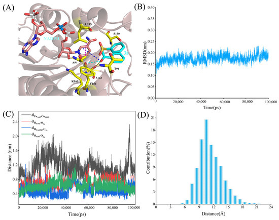 Binding properties of mutant LkKRED and 3a. The NADPH is shown as pink sticks; the substrate (3a) is shown as cyan sticks; key amino acid residues are highlighted as yellow sticks. (A) Binding structure of Y190S/S96T LkKRED and 3a. (B) RMSD of the complex in the simulation process. (C) Distance fluctuation of the catalytic process characterization. (D) Distance distribution between A94 and L195.