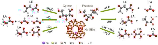 The heterogeneous process using Na-BEA zeolite revealed several plausible pathways for acid formation at active sites, consistent with experimental observations of mixed acid products. The proposed mechanisms highlight the role of Na+ centers in facilitating fructose and xylose adsorption and decomposition within the BEA zeolite framework. These findings provide valuable insights into the catalytic behavior of both systems and offer guidance for the rational design of zeolite-based catalysts for biomass valorization.
