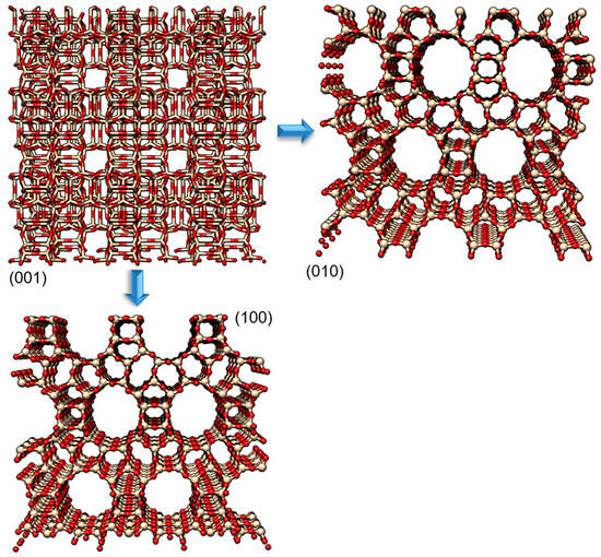 The structure of the BEA zeolite was taken from the Database of Zeolite Structure []. The tetragonal phase of the BEA framework type is described by the space group P 41 2 2 (No. 91) with lattice constants a = b = 12.6320 Å, and c = 26.1860 Å. The crystal unit cell contains 192 atoms. Figure 5 presents the structure of the BEA zeolite viewed along three crystallographic directions.