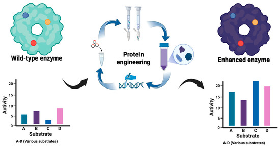 Biocatalysis has benefited from genetic engineering, which is a closely related field to protein engineering, differing in focus and techniques used. Genetic engineering is a process that involves the direct manipulation of an organism’s genes to enhance, modify, or remove specific properties pertaining to the organism [28]. In the context of biocatalysis, genetic engineering utilizes techniques such as Clustered Regularly Interspaced Short Palindromic Repeats (CRISPRs), cloning, and transformation to create new DNA constructs, commonly referred to as recombinant DNA [29]. Genetic engineering was used to construct a novel chimeric lysin (Ply187N-V12C) by fusing the catalytic domain of the bacteriophage lysin Ply187 with the cell-binding domain of the lysin PlyV12, which resulted in a hybrid that showed a broader lytic spectrum or host range [30]. Similarly, a soluble recombinant chimeric protein (CmAP/MBL-AJ) was created by fusing the genes encoding the marine bacterium Cobetia marina alkaline phosphatase (CmAP) and Far Eastern holothurian Apostichopus japonicus mannan-binding C-type lectin (MBL-AJ) [31]. The bifunctional hybrid demonstrated higher alkaline phosphatase activity and specificity relative to the wild-type. Table 1 below summarizes some genetically engineered proteins with their corresponding modified structural properties and industrial applications.