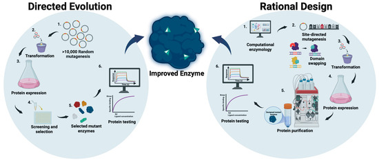 Protein engineering has made significant progress, with a number of noteworthy advancements in rational design and directed evolution techniques. The rational design of enzymes requires an in-depth understanding of enzyme structures and mechanisms and utilizes a moderately sized library [14] (Figure 3). On the other hand, directed evolution only needs a basic understanding of the structure and function of enzymes and requires a larger library size [14] (Figure 3). Regardless of which approach is used in enzyme design, the desired functionality can be achieved by addressing tradeoffs between activity and stability. In protein engineering, the two common techniques of rational design include site-directed mutagenesis and domain swapping. Site-directed mutagenesis is a technique that is used to introduce specific, targeted changes to the DNA sequence of a protein, whereas domain swapping involves the exchange of structural elements between two or more identical protein monomers to form dimers or multimers with desired novel protein properties [15,16]. Merz et al. used a rational approach to enhance the catalytic activity of the thermophilic enzyme indoleglycerol phosphate synthase (IGPS) at low temperatures by mutating the trpC gene, which encodes IGPS [17]. Further investigation of the IGPS mechanistic pathway showed that the low activity of the enzyme was caused by its rigid structure. Specific amino acid substitutions were conducted to increase flexibility, which significantly increased catalytic turnover at low temperatures. The Nobel Prize-winning technique, directed evolution, aims to accelerate the process of natural evolution in biological molecules and systems in a test tube through repetitive rounds of gene variation and screening [18,19,20,21]. The development of continuous directed evolution systems, like yeast OrthoRep, is a recent advancement in directed evolution. Such systems allow for simultaneous hypermutation and selection in vivo at rates that are roughly 100,000 times faster than the host genome [22]. Protein engineering processes have been integrated with computational design and machine learning techniques to improve the prediction of protein properties and to facilitate the rapid exploration of vast sequence spaces [23]. ProteinMPNN has demonstrated high success rates in de novo enzyme design [24], while deep learning models, such as AlphaFold and RoseTTAFold, have greatly enhanced protein structure prediction [25]. Ancestral sequence reconstruction (ASR) is another trend in enzyme engineering design and optimization, which involves inferring and resurrecting ancestral protein sequences to create enzymes with enhanced properties [26]. Thermophilic enzymes that maintain high catalytic activity at lower temperatures have been engineered using ASR [26]. Historical sequence changes in the structure and function of enzymes can also be identified via ASR, which makes it possible to reconstruct a protein family’s evolutionary history and provide causal insights into functional diversities [27].