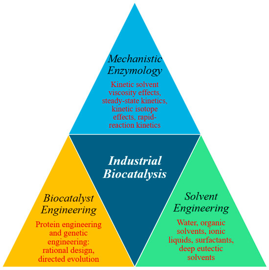 In Figure 4, we present a conceptual framework that highlights three important areas of industrial biocatalysis: biocatalyst engineering, solvent engineering, and mechanistic enzymology. Biocatalyst engineering includes those processes that directly modify the intrinsic properties of the enzyme, such as protein engineering and genetic engineering. Processes that involve changes to the enzyme’s surrounding environment (extrinsic), including the choice of solvent system, are classified under solvent engineering. Mechanistic enzymology, although sometimes overlooked, represents a core area that provides insights into enzyme behavior and will be the focus of this review.