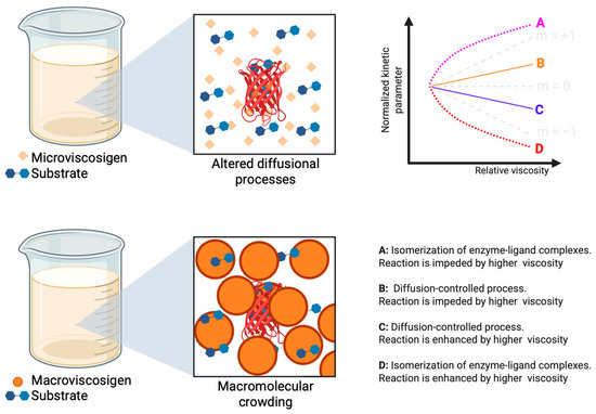 In addition to understanding the unique roles of amino acid residues in enzyme dynamics, information about enzyme function can be provided by solvent-sensitive steps in catalysis. Kinetic solvent viscosity effects (KSVEs) are a powerful technique that analyzes how changes in solvent viscosity affect the kinetic parameters of an enzymatic reaction to provide unique perspectives on the factors influencing enzyme function [48]. The theoretical basis of KSVEs, Kramers’ theory, lies in the principle that increased solvent viscosity creates friction against proteins in solution, decreasing motion and potentially inhibiting catalysis in motile enzymes [54]. The KSVE technique is considered a highly efficient and cost-effective technique because simple kinetic enzyme assays, such as the Michaelis–Menten kinetic approach, can be combined with it without requiring specialized and costly equipment. Techniques such as site-directed mutagenesis, pH effects, and kinetic isotope effects have been combined with KSVEs in recent research to provide detailed insights into the mechanisms of action of several enzymes, including D-2-hydroxyglutarate dehydrogenase, NADH:quinone oxidoreductase, and nitronate monooxygenase [55,56,57]. In a study on Pseudomonas aeruginosa NADH:quinone oxidoreductase, KSVEs with glucose and sucrose were used to probe the presence of a solvent-sensitive isomerization within the enzyme–substrate complex [56]. Further analysis revealed that flavin reduction was the rate-limiting step for the substrate benzoquinone, whereas hydride transfer from NADH to the FMN and quinol product release were partially rate-limiting for the substrate juglone [56]. Further details on the methods used to study KSVEs are covered in a review by Gadda and Sobrado [48]. Different aspects of enzyme reaction mechanisms can be probed using KSVEs, including diffusion-controlled substrate binding and rate-limiting steps, which could be one of or a combination of isomerization steps, the product release step, or the chemical step of catalysis [48]. According to the Stokes–Einstein equation, a molecule’s diffusion coefficient (D) is inversely proportional to solvent viscosity (η) [58]. An increase in solvent viscosity raises the frictional resistance experienced by enzymes and substrates in solution [59]. Consequently, any kinetic step that is diffusion-dependent, including substrate association, substrate dissociation, or product release, will slow down in direct proportion to the viscosity change [59]. In KSVE experiments, this is reflected as a linear decrease in the kcat/Km and kcat values, with slopes approaching 1 for fully diffusion-controlled steps, intermediate slopes (0 < m < 1) for mixed control, and a slope nearing zero when the chemical step of catalysis is rate-limiting [48]. Diffusion controls how rapidly enzyme and substrate molecules encounter each other and how quickly products exit the active site, establishing an upper limit to catalytic efficiency (kcat/Km ≈ 108–109 M−1·s−1 for large enzymes) [48]. The KSVE methodology essentially involves setting up protocols to measure initial velocity data in the presence of varying concentrations of an additive, usually polyhydroxylated compounds. When two substrates are required for complete enzyme activity, the concentration of one substrate may be fixed, while the concentration of the other is varied [11]. The same initial velocity measurement is repeated with the addition of different concentrations of a viscosigen, i.e., 0%, 9%, 15%, 30%, and 40%. Solvent microviscosigens, such as glucose, glycerol, and sucrose, create resistance to the motion of molecules in solution and are associated with the internal diffusion of a substrate into the active site of an enzyme [48] (Figure 5). Solvent macroviscosigens, on the other hand, include polymeric additives, such as Ficoll-400 and polyethylene glycol (PEG), and determine the free volume available to molecules moving in solution [48]. Increasing solvent macroviscosity can be used as a control for KSVEs to distinguish whether the observed viscosity effect arises from diffusion limitations rather than macromolecular crowding [48] (Figure 5). Table 2 below lists some microviscosigens and macroviscosigens, along with their respective typical molecular weights.