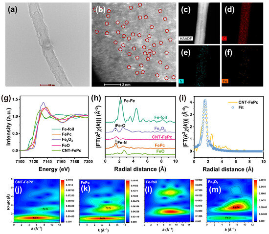 (a) TEM, (b) HAADF-STEM and (c–f) EDX mappings images of CNT-FePc; (g) Fe K-edge XANES spectra and (h) FT-EXAFS spectra of FePc, Fe foil, FeO, Fe2O3 and CNT-FePc; (i) EXAFS fitting curve in R space of CNT-FePc; (j–m) WT-EXAFS contour plots of different samples.