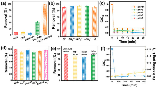(a) BPA removal efficiency in different degradation system. Effect of (b) different ions and HA and, (c) initial pH on BPA removal by the CNT-FePc/PMS system. (d) Removal efficiency of various contaminants by the CNT-FePc/PMS system. (e) BPA removal efficiency from different natural waters by the CNT-FePc activated PMS systems. (f) BPA removal efficiency of the CNT-FePc/PMS system over 600 min and the amount of Fe leakage. Reaction conditions: [PMS]0 = 2.0 mM, [Cl−]0 = [SO42−]0 = [HPO42−]0 = [HCO3−]0 = 10 mM, [HA]0 = 10 ppm, Contaminant concentration = 10 ppm, flow rate = 2.0 mL min−1, pH0 = 5, if not otherwise specified.