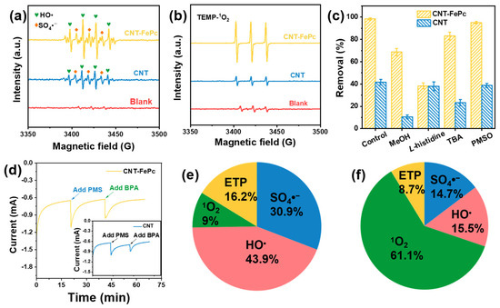 To further elucidate the ROS generation pathways and underlying reaction mechanisms, a series of radical scavenging experiments were performed. Methanol (MeOH), a non-selective quencher of both HO• and SO4•−, was used alongside L-histidine (a selective scavenger for 1O2), tert-butyl alcohol (TBA, a selective HO• scavenger), and methyl phenyl sulfoxide (PMSO, a scavenger of high-valent Fe–oxo species) [45,46,47]. As shown in Figure 3c, the addition of MeOH significantly decreased BPA removal efficiency by the CNT-FePc/PMS system from 98.4% to 68.7%. An even more pronounced decrease was observed in the CNT/PMS system, where BPA removal dropped from 41.6% to 10.7%, suggesting that HO• and SO4•− were the predominant ROS in the absence of FePc. In contrast, the addition of L-histidine led to a substantial reduction in BPA removal efficiency in the CNT-FePc/PMS system (down to 38.4%), but had minimal effect in the CNT/PMS system. This observation indicates that 1O2 played a major role in pollutant degradation when FePc was present. Furthermore, the addition of TBA resulted in only a slight decrease in BPA removal efficiency in the CNT-FePc/PMS system, further supporting the conclusion that HO• was not the dominant ROS in this system.