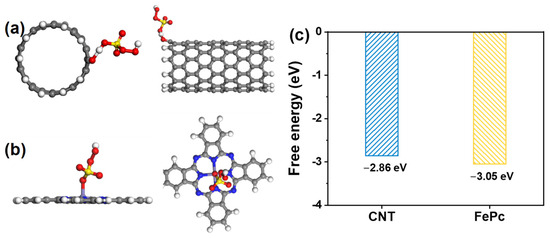 DFT-optimized adsorption configurations of PMS on (a) CNT and (b) FePc. (c) The adsorption energy of PMS on CNT and FePc.