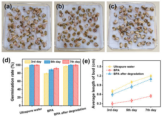 Photos of mung bean seeds on the seventh day treated with (a) ultrapure water, (b) BPA and (c) BPA after degradation. (d) Germination rate and (e) average length of buds of mung bean seeds treated with different solutions for a week.