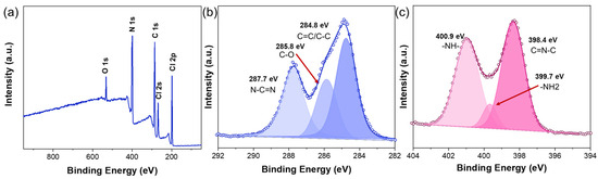 X-ray photoelectron spectroscopy (XPS) measurements confirm the elemental composition and chemical states of the CNTs/GCN composites. In the survey spectrum (Figure 3a), for the elements of C, N, O, and Cl can be found. The Cl originates from the NaCl source during the synthesis process. The O arises from the nitric acid treatment, by which the GCN was partially oxidized [29]. The high-resolution C1s XPS spectrum (Figure 3b) reveals three distinct binding energy peaks at 284.8 eV, 285.8 eV, and 287.7 eV, corresponding to the sp2 C in CNTs, C–O bonds, and the sp2 C in N–C=N configurations, respectively [30]. The high resolution N1s spectrum can be deconvoluted into three peaks at 398.4 eV, 399.7 eV, and 400.9 eV, respectively (Figure 3c), which correspond to C-N=C, -NH2, and C-NHx [31].