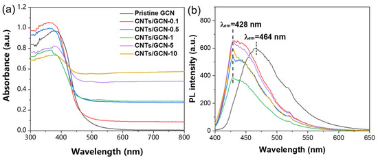The separation efficiency of photogenerated charges critically determine the photocatalytic performance of semiconductor materials [33]. In general, the photoluminescence (PL) intensity of a photocatalyst inversely correlates with its charge separation efficiency, as lower PL signals indicate suppressed recombination of photogenerated electron–hole pairs [34]. As evidenced by the PL spectra in Figure 4b, all CNTs/GCN hybrids exhibit significantly reduced fluorescence intensity compared with pristine GCN. Notably, the CNTs/GCN-1 composite demonstrates the lowest PL intensity, reflecting the highest charge separation efficiency among the series [35]. This phenomenon is attributed to the introduction of CNTs, which serve as electron-conducting pathways to facilitate interfacial charge transfer and inhibit the recombination of photogenerated carriers. It should be noted that the PL emission peak of CNTs/GCN hybrids shifted to 428 nm compared with pristine GCN (464 nm). It should be ascribed to the quantum size effect that is caused by the reduced dimension after the nitric acid treatment of GCN [29]. In all, the optical properties of the CNTs/GCN reflected an enhanced light-harvest capability and charge separation efficiency and is expected to show optimized photocatalytic activity.