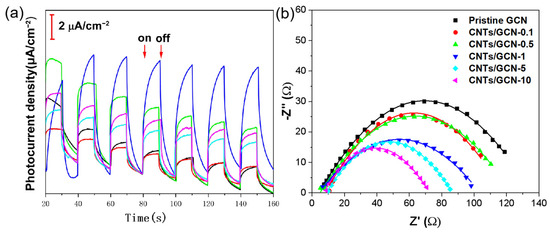 (a) Transit photocurrent response and (b) EIS of pristine GCN and CNTs/GCN-x samples.