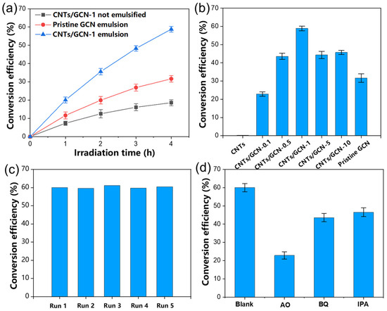 Based on the optimized emulsion system, photocatalytic BA conversion efficiency over different hybrids was performed, as shown in Figure 7b. All the hybrids showed improved CE towards BA oxidation under 4 h irradiation, compared with pristine GCN (Table S1). The CNTs/GCN-1 showed the highest CE (59.2%), which is consistent with the PEC measurement. The photocatalyst can be easily recovered and cyclically used after the reaction by centrifuging the emulsion and re-dispersing it in the oil/water system. Thus, the recyclability of the hybrids was performed, and the CE in each cycle was listed, as shown in Figure 7c, the CE of BA did not decrease significantly after 5 cycles, highlighting the excellent reusability of the emulsion photocatalytic system [41]. In addition, the characterizations of the CNTs/GCN-1 after the photocatalysis reaction showed that there was no crystalline structure deformation or functional group loss (Figure S8), confirming stability against repeated utilization.