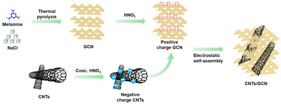 Schematic diagram of CNTs/GCN hybrid materials prepared by electrostatic assembly.