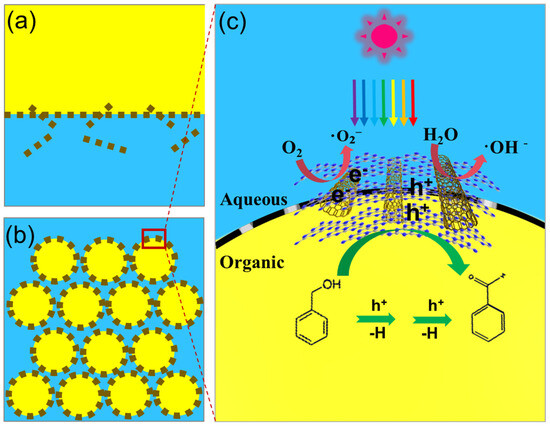 Illustration of (a) non-emulsion and (b) emulsion photocatalytic system for photocatalyst dispersed in the medium. (c) The proposed photocatalytic mechanism for benzyl alcohol oxidation in Pickering emulsion.