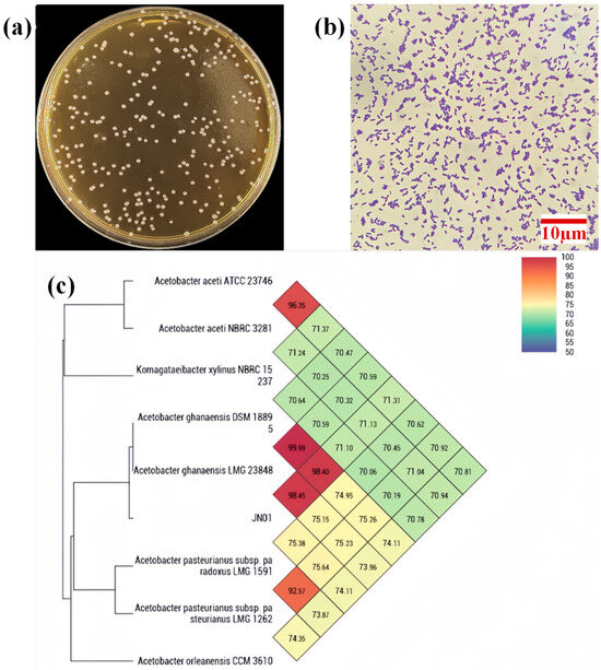 (a) Single colonies of JN01 were grown on an agar plate; (b) morphology (1000×) of JN01 under the microscope; (c) heatmap generated indicating orthologous average nucleotide identity values calculated among related Acetobacter genera.