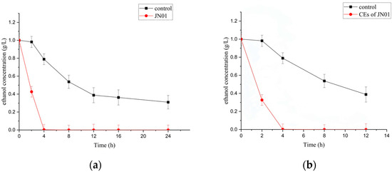Biodegradation of ethanol by whole cells (a) and CEs (b) of A. ghanensis JN01. “Control” refers to the same test conditions without whole cells or CEs.