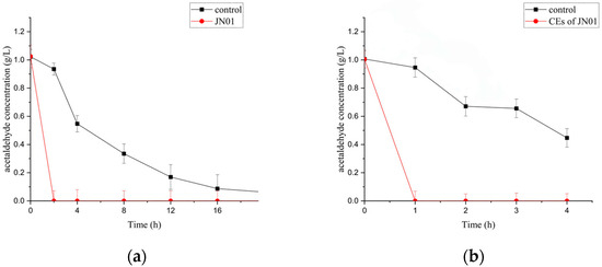 Biodegradation of acetaldehyde by whole cells (a) and CEs (b) of A. ghanensis JN01. “Control” refers to the same test conditions without whole cells or CEs.