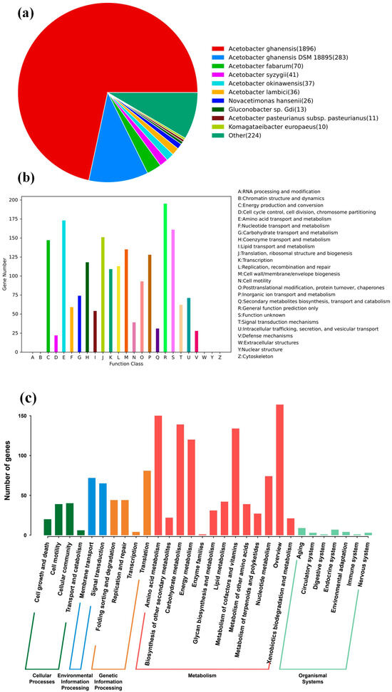 Statistical legend of gene annotation classification of A. ghanensis JN01. (a) NR function classification; (b) COG function classification; (c) histogram of KEGG.