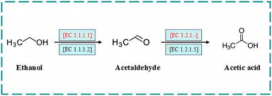 Pathway for biodegrading both ethanol and acetaldehyde by A. ghanensis JN01. The pathways in red are annotated based on the KEGG analysis. [EC 1.1.1.1], ADH; [EC 1.2.1.-], ALDH.