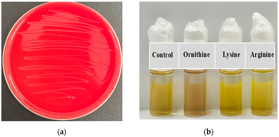 The strain also tested negative for biogenic amine production. When inoculated into decarboxylase media containing lysine, ornithine, or arginine, no purple color change was observed after 24 h at 37 °C (Figure 6b), suggesting the absence of amino acid decarboxylase activity. Consistently, gene annotation revealed no presence of decarboxylase-related sequences typically responsible for the formation of histamine, tyramine, or putrescine. Biogenic amines such as histamine and tyramine can cause adverse physiological effects, including hypertension and gastrointestinal discomfort [52,53].