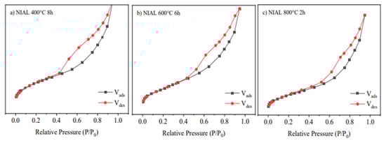 Figure 1 presents the N2 adsorption–desorption isotherms, which are used to evaluate the surface properties of the samples. According to the IUPAC classification [17], the isotherms for all samples calcined at different temperatures are categorized as Type IV, with an H3-type hysteresis loop. This formation is typical of hysteresis indicating capillary condensation, which is characteristic of mesoporous materials with pore sizes ranging between 2 and 50 nm.