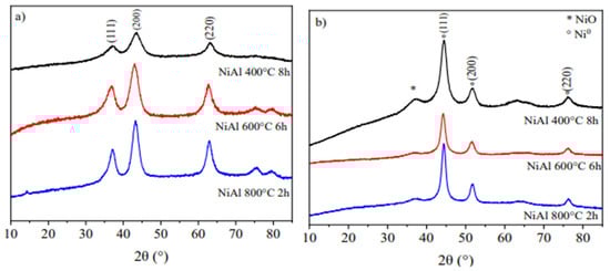 The calcination of nickel hydrotalcites (Ni-LDHs) has a significant impact on their structural and catalytic properties. Calcination leads to the decomposition of the lamellar structure of hydrotalcite, resulting in the formation of mixed oxides of nickel and aluminum (Ni-Al-O) and this effect can be observed in the XRD results presented in Figure 2. The calcined samples present reflections at 2θ angles = 37.3°, 43.2°, and 62.8°, respectively, and can be identified as the (111), (200) and (220) crystal planes in the face-centered cubic crystalline structure of NiO [9]. However, Ni-Al-O spinels also exhibit a similar diffraction pattern to that of NiO, and the peak at 37.5° may be associated with the phases of Ni-Al-O spinels (NiAl2O4–normal and Ni2AlO4–inverse) [9,19]. There are no reflections that could be associated with other crystalline compounds such as simple metal hydroxides.