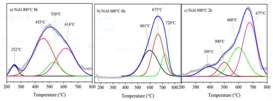 The wide range of reduction temperatures indicates the presence of different nickel oxide species [9,23]. The profiles were refined through deconvolution, and the temperature ranges were used to determine the reduced species. Bulk NiO, being an easily reducible phase, is the first to undergo reduction at lower temperatures between 250 °C and 400 °C. Smaller particles with larger surface areas tend to reduce more rapidly due to the increased contact area with the reducing gas. This effect is evident in the sample calcined at 400 °C, which exhibited a smaller crystallite size and greater surface area, and this phase represents approximately 50% for this sample. The sample calcined at 600 °C did not show a reduction peak at temperatures below 500 °C, whereas the sample calcined at 800 °C contained approximately 20% of this phase.