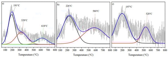 The presence of basic sites favors the adsorption of CO2, facilitating its activation and subsequent surface reactions. Furthermore, control of basic sites is essential to favor the oxidation of carbon deposits that may form. In our previous study, we assessed that the molar ratio of nickel significantly impacted the basicity of the catalyst [9]. In the current work, all samples contained an identical amount of nickel, resulting in a similar basicity across the three samples. The sample calcined at 600 °C exhibited lower basicity, likely due to a more uniform and homogeneous arrangement of nickel oxides, as suggested by the TPR analysis. The first peak at 185–190 °C, observed in all three samples, corresponds to the desorption of CO2 from weak Brønsted groups (−OH) [29]. The intermediate peak at 262–277 °C is due to bidentate carbonates formed in metal–oxygen pairs [26]. Desorption peaks above 430 °C are linked to CO2 bound to low-coordination oxygen anions, indicating strong basic sites [7,26]. An additional peak above 600 °C is attributed to the completion of the dehydroxylation process and the decomposition of carbonate anions formed during CO2 adsorption [30].