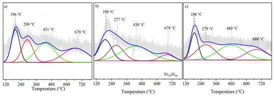 As has already been clearly demonstrated in this work, the calcination process had a great influence on the Ni phases of the catalyst, presenting different reduction properties. The CO2-TPD profiles of the samples after the reduction in a 10% H2/N2 atmosphere at 600 °C are shown in Figure 5. The results for the three samples showed four desorption peaks at similar temperatures, the deconvolution of these profiles were compiled in Table 3. As reported in the literature, the basic sites on the catalyst surface can be classified into three types: weak basic sites located at about 160 °C, medium basic sites from 200 °C to 400 °C, and strong basic sites above 400 °C [26,27]. The basicity of mixed oxides derived from hydrotalcite is strongly dependent on the layer compositions, the presence of promoters, and the type of anions present between the interlayer spaces [28,29].