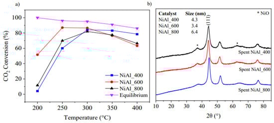 After the CO2 methanation reaction, the catalysts were characterized by XRD (Figure 6b) and the results indicate that there is no evidence of carbon deposition, whereas the crystalline structure was preserved and no new phase was detected in the NiAl-400, NiAl-600 and NiAl-800. The Ni reflections indicate that there was no sintering according to the crystallite sizes calculated by the Scherrer equation, determined from reflection of Ni0 at 44.5°. The crystallite size of the spent samples did not show any significant difference in relation to the samples reduced before the reaction (fresh samples). This observation indicates the absence of sintering, thereby ensuring the stability of the catalyst structure.