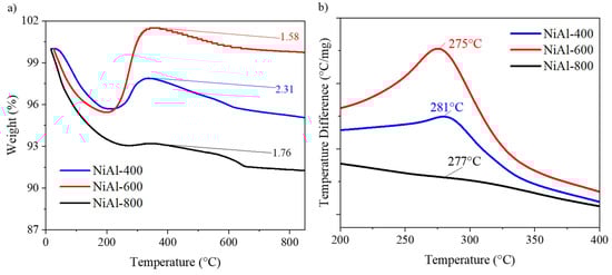 Temperature-programmed oxidation (TPO) was performed on the spent catalysts, as shown in Figure 7. This analysis aimed to identify and quantify carbonaceous species deposited on the catalyst surface, providing valuable insights into their stability and efficiency. The initial weight loss observed below 160 °C was attributed to the thermal desorption of water and CO2 adsorbed during the reaction, with water being a primary product of the methanation process. Between 160 °C and 400 °C, a weight gain was recorded for all samples, corresponding to the reoxidation of metallic Ni0 crystallites that remained after the catalytic tests [16]. Differential thermal analysis (DTA) revealed slight variations in the peak reoxidation temperature, with the NiAl-800 catalyst showing the lowest degree of reoxidation. Above 400 °C, weight loss was associated with the oxidation of carbonaceous deposits.