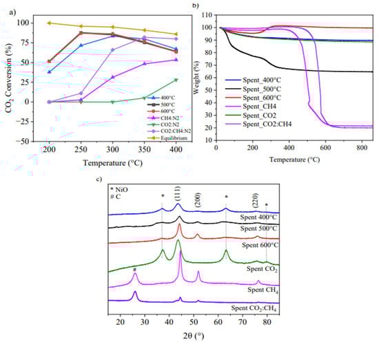 To investigate the presence of carbon deposits in spent samples, temperature-programmed oxidation (TPO) was conducted using a thermobalance (SDT Q600, TA Instruments, Newcastle, DE, USA). The samples (10 mg) were heated from ambient temperature to 800 °C at a rate of 10 °C/min in a synthetic air flow (100 mL/min) [9,16,19].