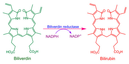 Bilirubin is an important mammalian metabolic product, mainly derived from the breakdown of hemoglobin in aging red blood cells. As red blood cells age, their membranes rupture and hemoglobin is engulfed and digested by macrophages, releasing heme. The porphyrin ring of heme is cleaved to form biliverdin IXα by heme oxygenase (HO, EC 1.14.99.3), which exists in multiple isoforms, including the well-characterized HO-1 and HO-2, as well as the more controversial HO-3, whose functional significance remains under investigation [1,2]. Among these, HO-1 is the predominant isoform. The term “biliverdin” typically refers specifically to this isomer. Biliverdin is subsequently reduced by biliverdin reductase (BVR, EC 1.3.1.24) to produce bilirubin [3]. The transformation of biliverdin into bilirubin by BVR is illustrated in Figure 1.