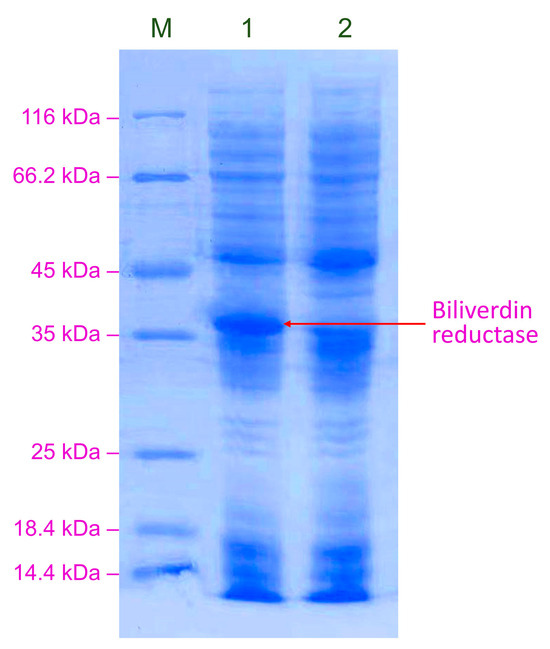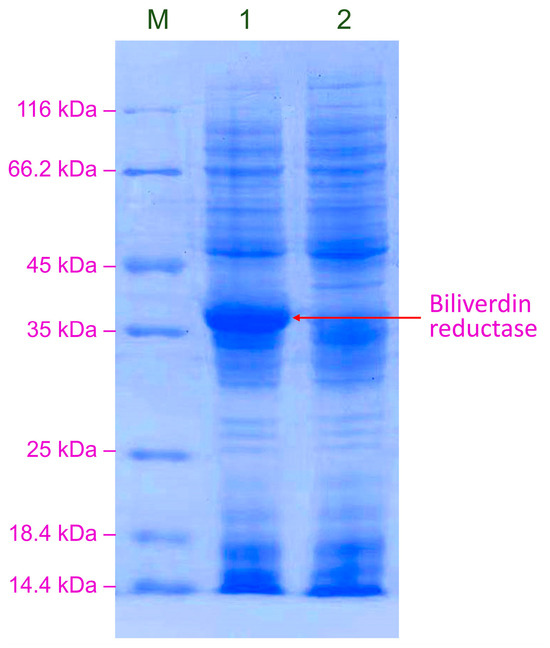 SDS-PAGE analysis of BVR expressed by GS115-bvdR under optimized overexpression conditions. Lane M: protein marker; Lane 1: GS115-bvdR; Lane 2: GS115-pPICZB.