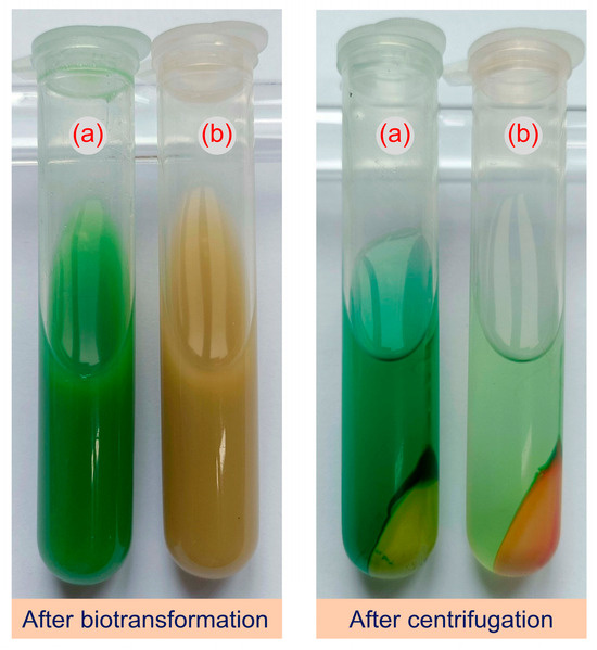 The biotransformation mixture was centrifuged at 8500× g for 10 min, the cell pellet was retained, and the cells were washed twice with deionized water and resuspended in methanol/dichloromethane (10 mL, 2:1 v/v). The extraction was performed by ultrasonication at 0 °C and 100 W for 30 min, and then the extract was centrifuged at 8500× g for 5 min, retaining the supernatant. The supernatant was analyzed by high-performance liquid chromatography (HPLC) after being filtered through a 0.22 μm membrane.