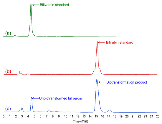 HPLC analysis of cell extracts after GS115-bvdR biotransformation of biliverdin: (a) biliverdin standard; (b) bilirubin standard; (c) GS115-bvdR cell extracts.