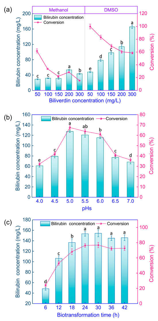 Optimization of conditions for biotransformation of biliverdin to bilirubin by GS115-bvdR resting cells. Differences in final bilirubin concentration and conversion (a) with methanol or DMSO as co-solvent; (b) at different medium pH values; and (c) after different biotransformation times. Vertical bars represent the mean ± standard error. Different letters on the bars indicate that the values are significantly different at the p < 0.05 level.