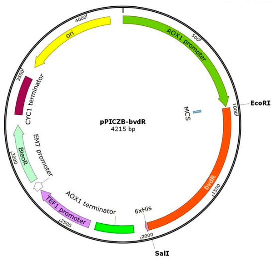The DNA sequence encoding BvdR (bvdR, Gene ID: 14615643 (sequence shown in Supplementary Material: Table S1) from Synechocystis 6803, retrieved from the NCBI database (https://www.ncbi.nlm.nih.gov, accessed on 15 April 2022), was optimized using K. phaffii-preferred codons (GenSmartTM, https://www.genscript.com.cn/tools/gensmart-codon-optimization, accessed on 18 April 2022; the sequence is shown in Supplementary Material: Table S1). The EcoR I and Sal I digestion sites were introduced upstream (5′-GAATTC-3′) and downstream (5′-GTCGAC-3′), respectively. The synthesized (by Beijing Qingke Biotech Co., Ltd., Beijing, China) bvdR sequence and vector pPICZB were digested with EcoR I and Sal I, respectively. They were then ligated using the T4 DNA ligase and transformed into E. coli DH5α-competent cells. The recombinant E. coli was cultured on LB plates containing zeocin (50 μg/mL). The colonies were then picked to verify the positive transformants by PCR. The recombinant vector pPICZB-bvdR (plasmid map in Figure 9) was extracted from the positive transformants after being cultured in LB medium containing zeocin (50 μg/mL).