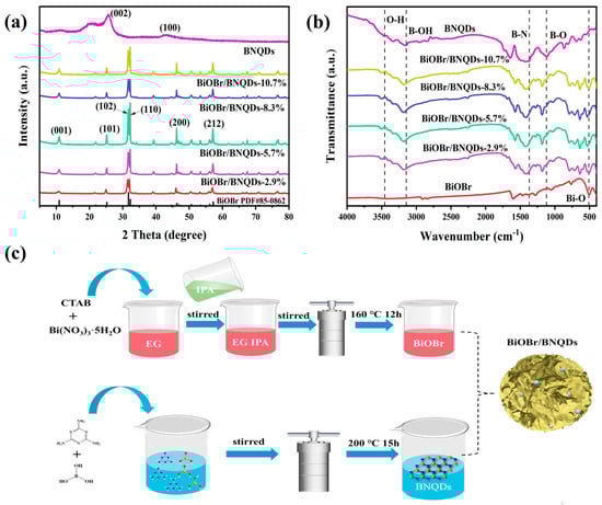 (a) XRD patterns and (b) FT-IR spectra of BiOBr, BNQDs, and BiOBr/BNQDs with different mass ratios. (c) Diagrammatic sketch of the synthesis process.