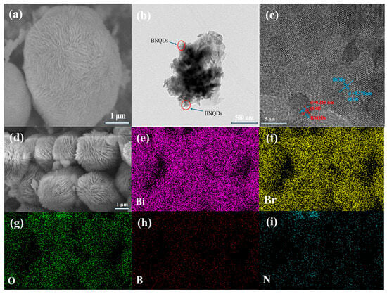 (a) SEM images of BiOBr and (b,c) TEM images of BiOBr/BNQDs-8.3%. (d) SEM image of BiOBr/BNQDs-8.3%. EDS mapping images of (e) Bi, (f) Br, (g) O, (h) B, and (i) N.
