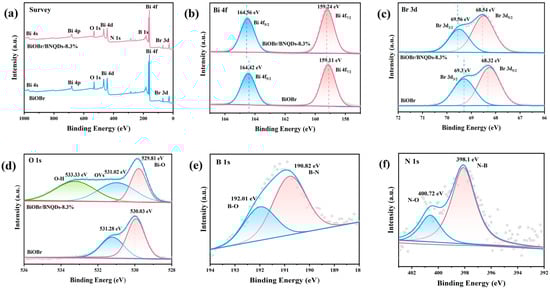 Subsequent analysis of the elemental composition and valence states of the prepared catalysts were conducted using X-ray photoelectron (XPS) testing. As illustrated in Figure 3a, the composition of BiOBr consisted of Bi, O, and Br elements, while the BiOBr/BNQDs-8.3% composite material constituted of Bi, Br, O, B, and N elements. In the high-resolution XPS spectrum of Bi 4f in Figure 3b, for BiOBr, the two peaks at 159.11 and 164.42 eV correspond to the Bi 4f7/2 peak and Bi 4f5/2 peak, respectively [32]. This implied that Bi was mainly present in the form of Bi3+. The Bi 4f peaks in BiOBr/BNQDs-8.3% were identified at 159.24 and 164.56 eV, which also implied that in BiOBr/BNQDs-8.3% samples, Bi was mainly present in the form of Bi3+. But the peaks shifted towards higher binding energies in comparison to pure BiOBr. As illustrated in Figure 3c, the Br 3d XPS spectrum of pure BiOBr exhibited two peaks at 68.32 and 69.3 eV, which were attributed to the characteristic peaks of Br 3d5/2 and Br 3d3/2, respectively. Compared to that of pure BiOBr, the Br 3d peak of BiOBr/BNQDs-8.3% moved towards a larger binding energy. The Bi 4f and Br 3d peaks of BiOBrBNQDs-8.3% exhibited a shift towards higher binding energies, indicating that the electron migration pathway was from BiOBr to BNQDs [33]. Figure 3d, the O 1s spectra of the original BiOBr could be separated into two peaks at 530.03 and 531.28 eV, while BiOBr/BNQDs-8.3% could be decomposed into three peaks at 529.81, 531.02, and 533.33 eV, corresponding to lattice oxygen (Bi-O) in BiOBr, oxygen vacancies (OVs) formed during synthesis, and chemically adsorbed oxygen species (-OH), respectively [34]. As demonstrated in Figure 3e, the B 1s spectrum of BiOBr/BNQDs-8.3%, two binding energy peaks at 190.82 and 192.01 eV were detected. These peaks were attributed to the stretching vibrations of the B-N and B-O bonds. As demonstrated in Figure 3f, the peaks observed at 398.1 and 400.72 eV in the N 1s spectrum of BiOBr/BNQDs-8.3% correspond to the B-N and N-O bonds, respectively. In addition, it could be found that the XPS peaks of BiOBr/BNQDs-8.3% presented slight shifts, which was because of the electronic interactions between BiOBr and BNQDs [35].